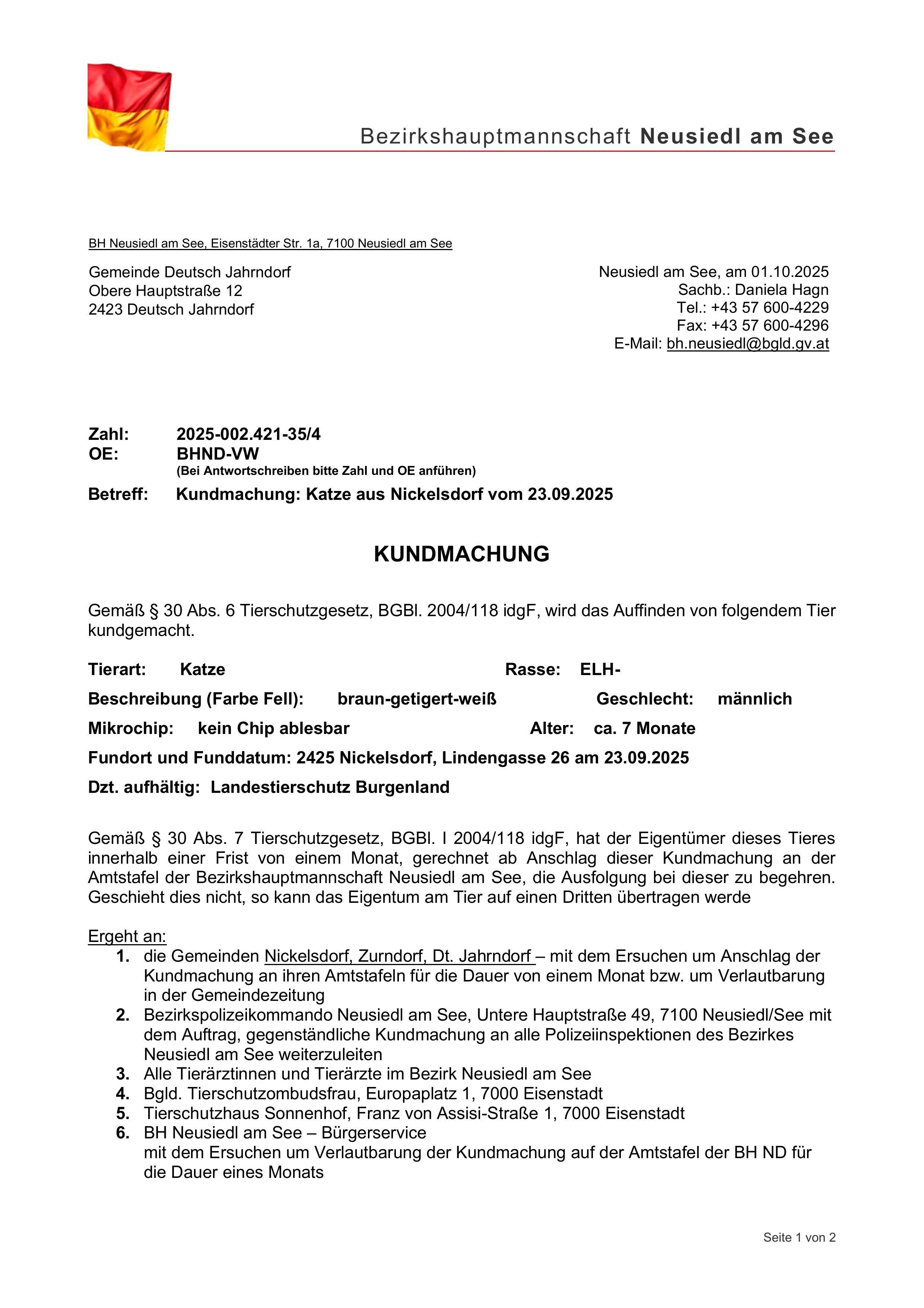 Deutsch Jahrndorfvor 3 WochenBH - Schreiben_Gemeinde Deutsch Jahrndorf2 SeitenFotos der Katze3 Seiten